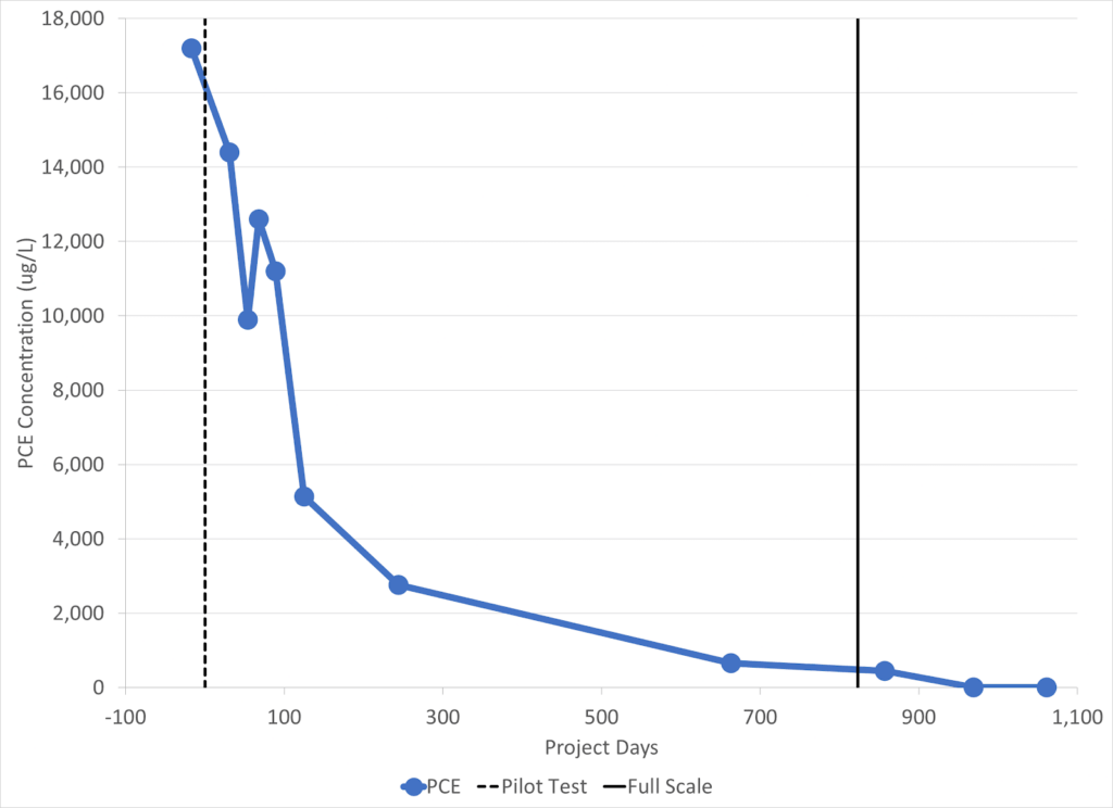 The pilot test was successful in reducing PCE concentrations at the target well by 2 orders of magnitude (Figure 2), and optimized emplacement of the amendment was demonstrated using confirmation soil borings. These outcomes supported the plan to move forward with the full-scale injection event. Currently, the PCE concentration at the pilot test target well has been reduced to 1.46 ug/L, a 99.99% reduction compared to baseline (pre-pilot test). The onsite pump and treat system was decommissioned in 2022 based on the results obtained by the full scale remediation effort. The site is currently in a long-term monitoring program.