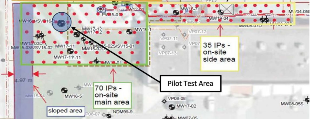 A pilot test was implemented in 2019 with six injection points (IPs) using GeoTAP; two postinjection boreholes were drilled to verify the distribution of BOS 100. Full-scale injection of BOS 100 was completed in 2021. Following access with the GeoTAP method, 105 IPs were completed on-site.